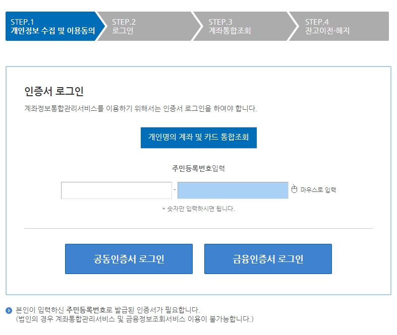 3. 주민등록번호 입력 후 공동인증서로 로그인합니다.