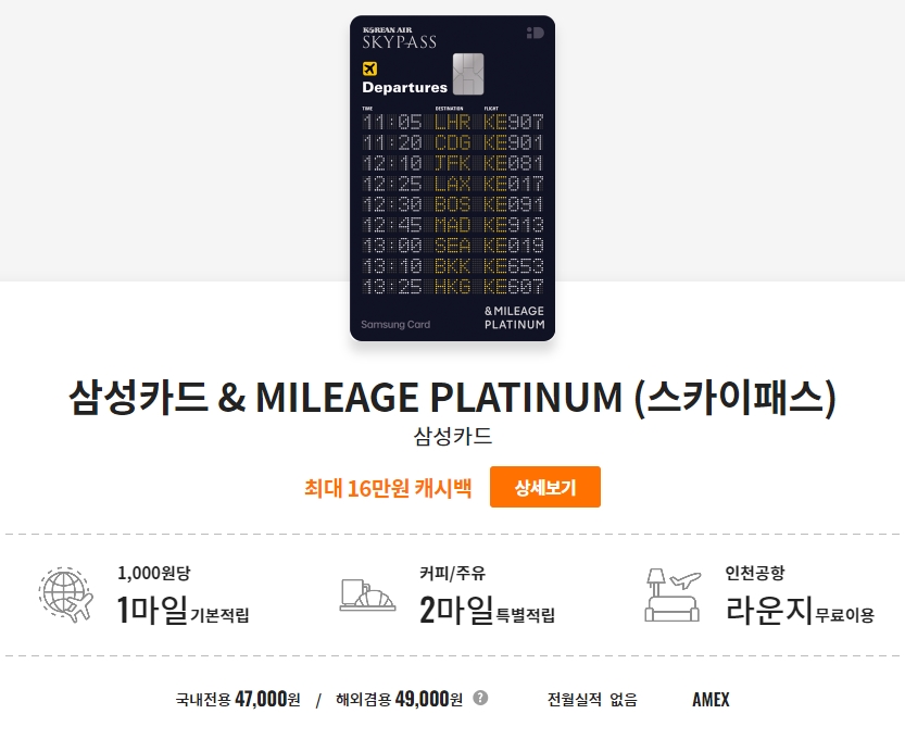 대한항공 모든 가맹점 이용금액 1,000원당 1 마일리지 기본적립 /