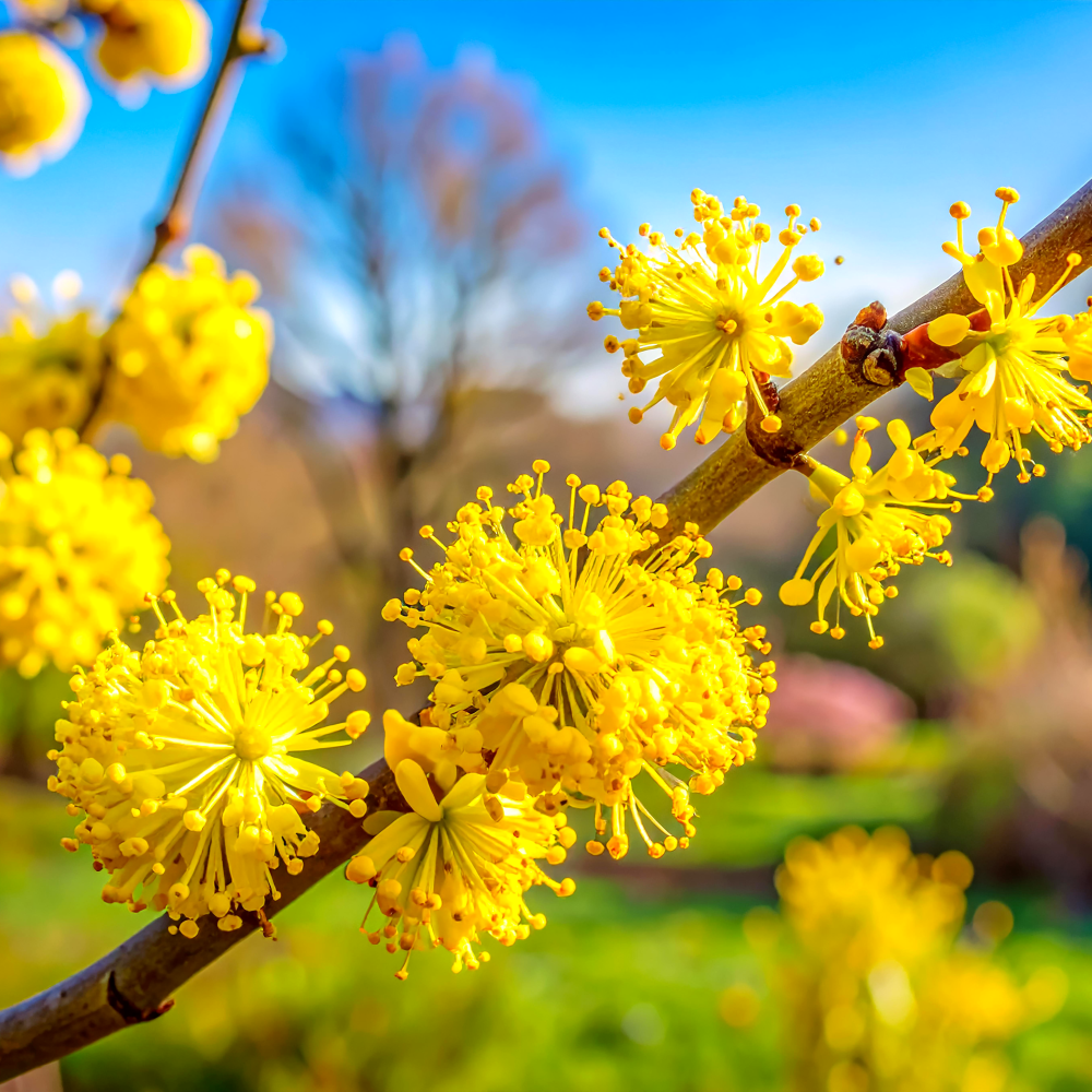 - 개화 시기 (3~4월): 잎이 돋기 전, 20~30개의 작은 노란 꽃들이 모여 우산 모양(산형꽃차례)을 이루며 핍니다.